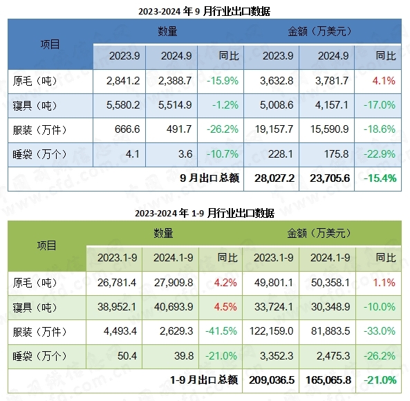 2024年前三季度,我國(guó)羽絨行業(yè)出口總額約16.5億美元,同比下滑21.0%,降幅環(huán)比1-8月小幅縮窄0.9個(gè)百分點(diǎn),原毛和寢具出口量同比小幅上漲,服裝出口量大幅下滑。具體來(lái)看,1-9月原毛出口量約2.8萬(wàn)噸,同比上漲4.2%,出口額約5.0億美元,同比略漲1.1%;寢具出口量約4.1萬(wàn)噸,同比上漲4.5%,出口額約3.0億美元,同比下滑10.0%;服裝出口量約2629.3萬(wàn)件,同比大幅下滑41.5%,出口額約8.2億美元,同比下滑33.0%。