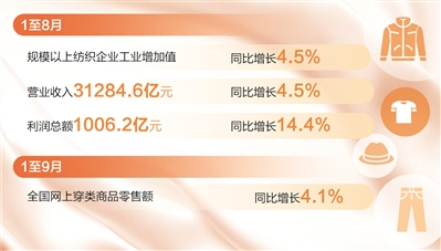 近年來(lái),我國(guó)紡織服裝產(chǎn)業(yè)著力深化轉(zhuǎn)型升級(jí),技術(shù)改造不斷加強(qiáng),創(chuàng)新場(chǎng)景更加豐富,新國(guó)潮、新中式等消費(fèi)亮點(diǎn)頻出。1—8月,規(guī)模以上紡織企業(yè)工業(yè)增加值同比增長(zhǎng)4.5%;營(yíng)業(yè)收入31284.6億元,同比增長(zhǎng)4.5%;利潤(rùn)總額1006.2億元,同比增長(zhǎng)14.4%,行業(yè)生產(chǎn)平穩(wěn)回升,經(jīng)濟(jì)效益持續(xù)改善。