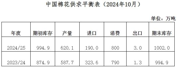 中國(guó)棉花協(xié)會(huì)10月預(yù)測(cè):2024/25年度全國(guó)棉花產(chǎn)量620.1萬(wàn)噸,較上期上調(diào)16.5萬(wàn)噸,同比增長(zhǎng)5.5%;棉花進(jìn)口量190萬(wàn)噸,同比下降41.3%;消費(fèi)量800萬(wàn)噸,同比增長(zhǎng)1.3%;期末庫(kù)存1002萬(wàn)噸,同比增長(zhǎng)0.7%。