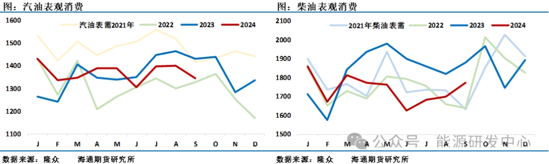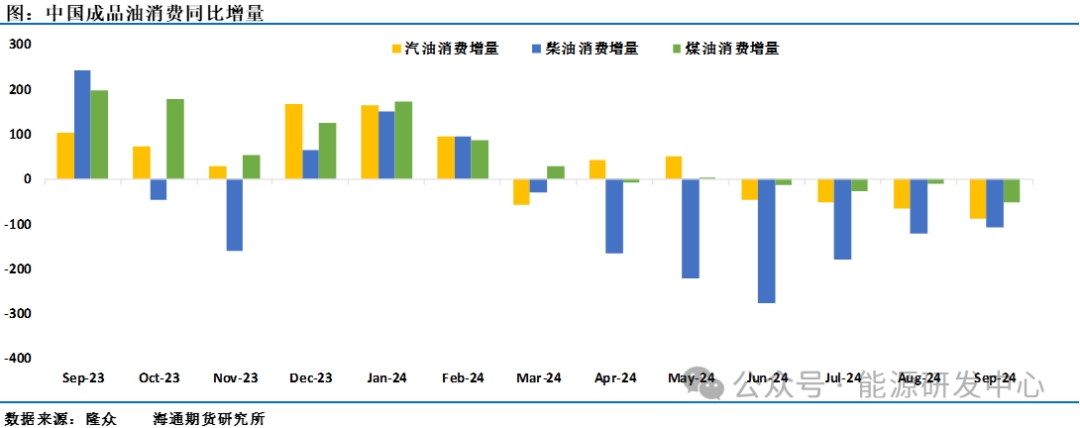 需求端美國煉廠檢修季迎來拐點(diǎn),后期預(yù)計美國煉廠開工率繼續(xù)回升,成品油表需環(huán)比小幅回落,各類主要油品表需走勢分化。出行方面,主要油品汽油有小幅回升,但航煤有小幅下降;與美國節(jié)奏不同的是中國原油加工量開始從10月中旬高位回落,主要是主營煉廠減少了加工量。在10月月報中各大機(jī)構(gòu)均提及了2024年中國原油需求低于預(yù)期的問題,同時對中國市場在政府層面推出積極經(jīng)濟(jì)政策的背景下對2025需求的增長重新抱有較高期待,從目前中國統(tǒng)計的產(chǎn)業(yè)數(shù)據(jù)可以看出,中國汽柴與均與去年的消費(fèi)有明顯差距,尤其是9月份汽油消費(fèi)不但同比差距明顯,環(huán)比也在走低,柴油表觀消費(fèi)環(huán)比有所增長,但同比仍有較大差距,疲弱的需求對國內(nèi)成品油價格壓制明顯,這也導(dǎo)致下半年來中國原油加工量與去年同期保持110萬桶/日的差據(jù)。因盈利性較差導(dǎo)致成品油市場貿(mào)易活躍度下降,庫存在這期間下降明顯,柴油在季節(jié)性消費(fèi)反彈情況下10月份價格有所反彈,但汽油這期間延續(xù)了弱勢,整體國內(nèi)成品油裂解差維持低位,接下來仍有反彈修復(fù)機(jī)會。