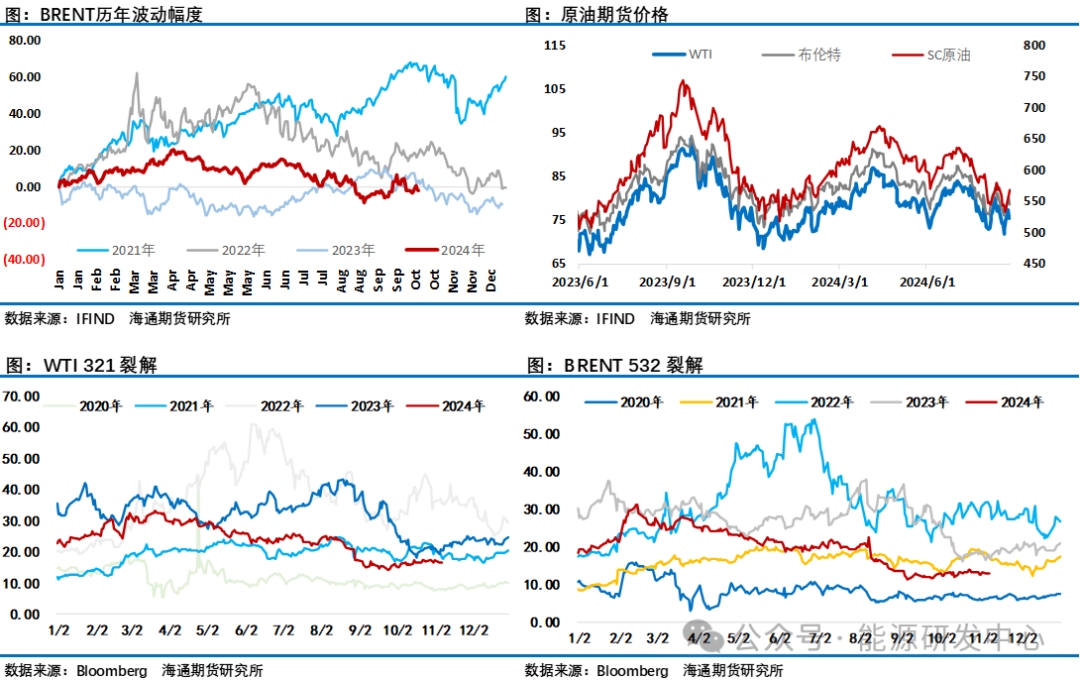 在這之前原油(607, -8.60, -1.40%)經(jīng)歷了相對平淡的一周,油價在來回拉鋸之后周五夜盤收漲于一周高位,周漲幅4%。地緣、宏觀、供需層面均沒有給出明確指引,這讓油價維持在地緣風(fēng)險降溫后最近二周構(gòu)建的窄幅區(qū)間內(nèi)震蕩蓄勢節(jié)奏中,中東地緣層面以色列做出了讓美國認(rèn)為合適的回應(yīng)以及伊朗可接受的回?fù)袅Χ茸尵o張局勢降溫,接下來整個金融市場都將密切關(guān)注美國總統(tǒng)大選窗口的一些變化帶來的影響,進(jìn)一步增加了投資者的觀望情緒。油價處在一個階段性的多空相持階段,高頻指標(biāo)層面月差結(jié)構(gòu)穩(wěn)中走弱,10月份雖然有地緣風(fēng)險影響,但資金對原油市場展望仍非常謹(jǐn)慎,而反映終端需求的歐美煉油利潤9月份之后基本維持在一個水平走勢中,下游需求對油價影響較小。中國市場近期柴油市場有所回暖,但汽油持續(xù)弱勢,整體煉油利潤改善程度仍然有限,,這意味著需求端驅(qū)動仍非常有限。