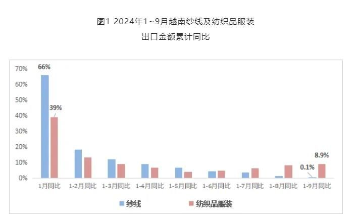 2024年以來,越南紡織品服裝出口延續(xù)2023年下半年以來的良好勢頭,實現(xiàn)穩(wěn)步增長。1月出口額同比增幅高達39%,為2024年上半年最高增速,到6月累計出口增速放緩至4.6%。進入三季度,增速開始緩慢回升。從主要市場看,今年1~9月越南對美國、日本和中國出口的紡織品服裝金額實現(xiàn)增長。其中,越南對美國出口120.1億美元,同比增加9.1%;對日本和中國分別出口31.3億美元和9.8億美元,分別同比增長6.4%和18.3%。同期,越南對韓國出口紡織品服裝同比下降1.9%至23.8億美元。