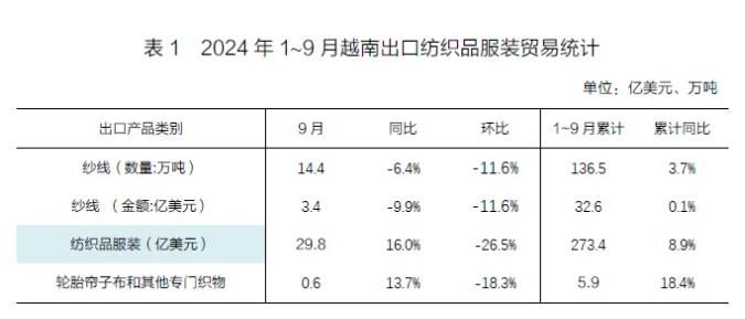 根據(jù)越南海關(guān)統(tǒng)計數(shù)據(jù)顯示,今年1至9月越南紡織品服裝(不含紗線)出口額273.4億美元,同比增長8.9%;出口紗線32.6億美元,與去年同期基本持平。9月當(dāng)月,越南出口紡織品服裝29.8億美元,同比增長16.0%;出口紗線3.4億美元,同比減少9.9%。
