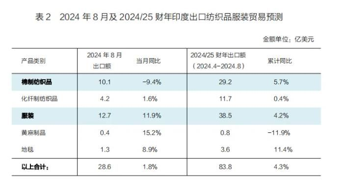 印度商業(yè)工業(yè)部公布的2024年8月出口預(yù)估數(shù)據(jù)顯示,今年8月,印度向全球出口棉制紡織品10.1億美元,同比減少9.4%;出口服裝12.7億美元,同比增加11.9%。加上化纖制紡織品、黃麻制品以及地毯等產(chǎn)品,印度以上紡織品服裝8月出口額共計28.6億美元,同比增加1.8%。