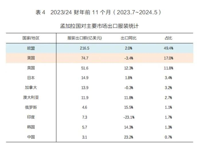 從主要市場看,2023/24財年前11個月孟加拉國對歐盟、英國和澳大利亞等發(fā)達經(jīng)濟體市場出口實現(xiàn)較快增長。其中,孟加拉國對歐盟出口服裝216.5億美元,同比增長2%,占對全球出口比重的49.4%;對英國出口服裝51.6億美元,同比上升12.3%,占比11.8%。同期孟加拉國對美國出口服裝74.7億美元,同比減少3.4%,占其服裝出口總額的17%;對中國出口服裝3.1億美元,同比增長23.2%,占比0.7%。