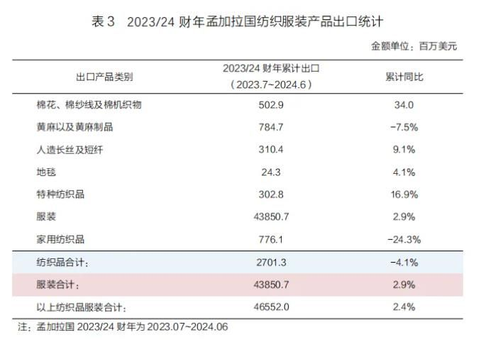 根據(jù)孟加拉國服裝制造及出口商協(xié)會(BGMEA)數(shù)據(jù),2023/24財年前11個月(2023.7~2024.5),孟加拉國對全球出口服裝438.5億美元,同比增加2.9%。其中,針織服裝出口247.1億美元,同比增長6.2%;機織服裝出口191.4億美元,同比減少1.1%。同期,孟加拉國對全球出口紡織品27億美元,同比下降4.1%。