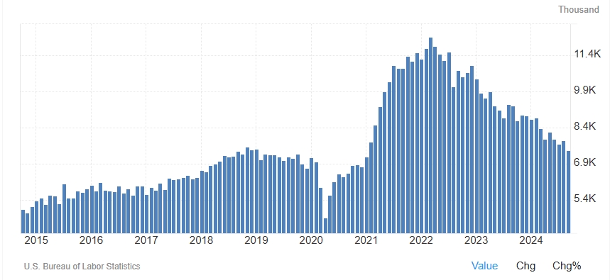 美國勞工部公布的具體數(shù)據(jù)顯示,截至9月底的職位空缺數(shù)量降至744萬個(gè),創(chuàng)2021年1月以來最低水平,低于市場(chǎng)預(yù)期的800萬個(gè),符合勞動(dòng)力市場(chǎng)的放緩勢(shì)頭。