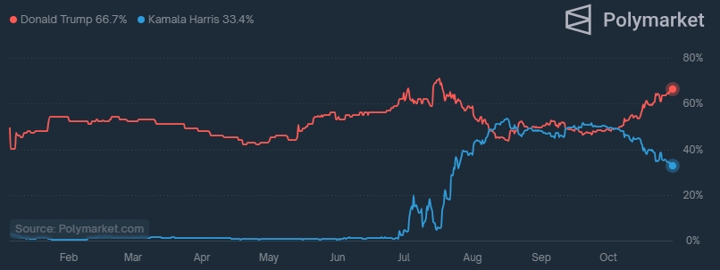 而在特朗普勝選概率越來越大的前提下,投資者對(duì)美國未來一段時(shí)間的經(jīng)濟(jì)感到擔(dān)憂。多項(xiàng)最新民調(diào)顯示,特朗普領(lǐng)先于哈里斯,博彩市場(chǎng)更是押注特朗普能贏得“很輕松”。