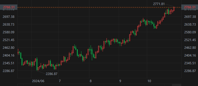 周二(10月29日)紐市早盤,現(xiàn)貨黃金價(jià)格明顯拉升,一度升破2770關(guān)口,最高升至每盎司2771.81美元,續(xù)刷紀(jì)錄新高。