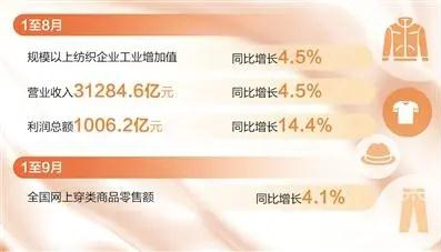 近年來,我國紡織服裝產(chǎn)業(yè)著力深化轉(zhuǎn)型升級,技術(shù)改造不斷加強,創(chuàng)新場景更加豐富,新國潮、新中式等消費亮點頻出。1—8月,規(guī)模以上紡織企業(yè)工業(yè)增加值同比增長4.5%;營業(yè)收入31284.6億元,同比增長4.5%;利潤總額1006.2億元,同比增長14.4%,行業(yè)生產(chǎn)平穩(wěn)回升,經(jīng)濟效益持續(xù)改善。