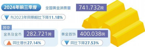 中國黃金協(xié)會近日發(fā)布的數(shù)據(jù)顯示,2024年前三季度,全國黃金消費量741.732噸,與2023年同期相比下降11.18%。其中:金條及金幣282.721噸,同比增長27.14%;黃金首飾400.038噸,同比下降27.53%。