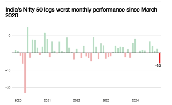 10月31日,印度NSE Nifty 50指數(shù)下跌0.56%,至24205.35點(diǎn)。而BSE Sensex指數(shù)下跌0.69%,至79389.06點(diǎn)。這兩個(gè)基準(zhǔn)在10月份都下跌了約6%,創(chuàng)下了自2020年3月新冠疫情引發(fā)全球市場(chǎng)大幅下滑以來最糟糕的月度表現(xiàn)。