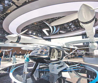 第七屆進(jìn)博會(huì)汽車展區(qū),參觀者正在參觀御風(fēng)未來(lái)M1載人飛行器。