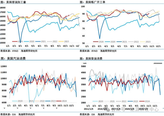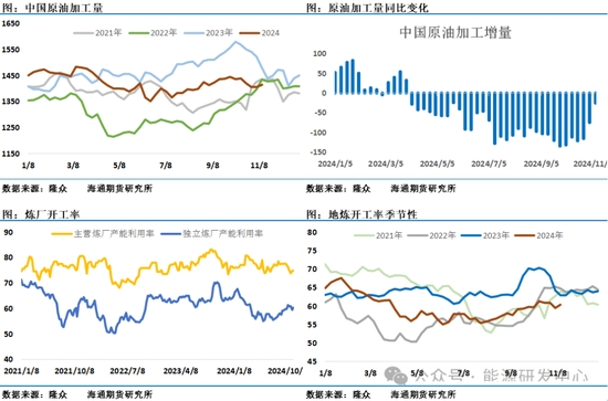需求端美國原油加工量進入檢修季結束之后的季節(jié)性回升階段,但終端消費表現(xiàn)一般,這將給汽柴油帶來持續(xù)累庫壓力。中國市場方面原油進口量連續(xù)第六個月同比下降,海關總署數(shù)據(jù)顯示,中國10月份的原油進口量為4470萬噸,大約相當于每天1053萬桶,同比下降了9%,這是連續(xù)第六個月同比下降,進口量低于9月份的1107萬桶/日和2023年10月的1153萬桶/日。從全年數(shù)據(jù)來看2024年中國原油加工量下降已經(jīng)是確定性事件,需求疲弱對油價的利空壓制仍是確定性的因素。