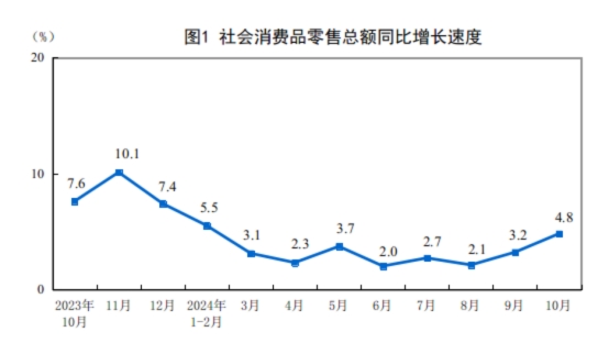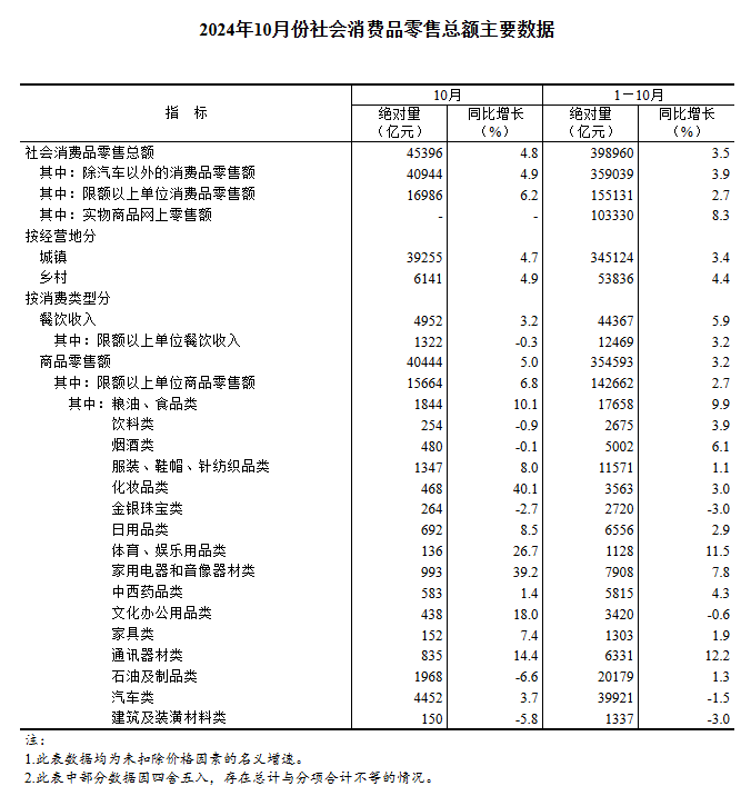 10月份,社會消費品零售總額45396億元,同比增長4.8%,增速比上月加快1.6個百分點。其中,除汽車以外的消費品零售額40944億元,增長4.9%。1—10月份,社會消費品零售總額398960億元,同比增長3.5%。其中,除汽車以外的消費品零售額359039億元,增長3.9%。