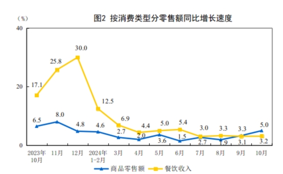 按消費類型分,10月份,商品零售額40444億元,同比增長5.0%;餐飲收入4952億元,增長3.2%。1—10月份,商品零售額354593億元,增長3.2%;餐飲收入44367億元,增長5.9%。