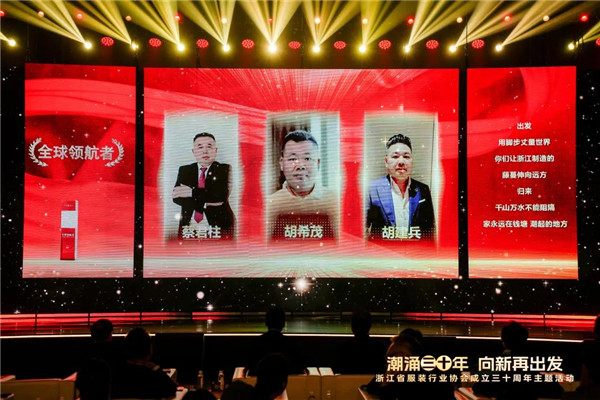 在省外浙商及海外人物表彰環(huán)節(jié),比音勒芬服飾股份有限公司董事長謝秉政、廣東佛倫斯集團有限公司董事長吳國勝、蘋果(中國)有限公司董事長施銀煥被授予了“卓越人物”稱號;法國華僑華人會主席蔡君柱,意大利中國貿(mào)易發(fā)展促進會第二屆理事會主席、意大利華人企業(yè)協(xié)會副理事長胡希茂,意大利中部文成同鄉(xiāng)會榮譽會長、意大利中國和平統(tǒng)一促進會榮譽會長胡建兵榮獲“全球領(lǐng)航者”殊榮。蔡君柱與胡建兵在“領(lǐng)航對話”中分享了各自在海外打拼的艱辛歷程與寶貴經(jīng)驗,為參會者帶來了深刻的啟示與鼓舞。大會同時頒發(fā)了眾多行業(yè)獎項。