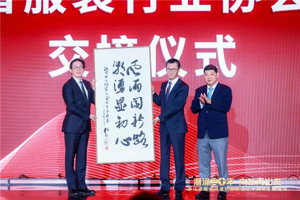 在隨后進行的新老會長交接儀式上,中國紡織工業(yè)聯(lián)合會副會長、中國服裝協(xié)會會長陳大鵬,浙江服裝行業(yè)協(xié)會第七屆會長馮德虎共同將一幅由中國紡織工業(yè)聯(lián)合會原會長杜鈺洲親筆題寫的“風雨闖新路,潮涌顯初心”的墨寶交到新任會長鄭念華手中。這一莊重的交接儀式,不僅是對老一輩服裝人的崇高敬意,更是對新一代服裝人的殷切期望與重托。