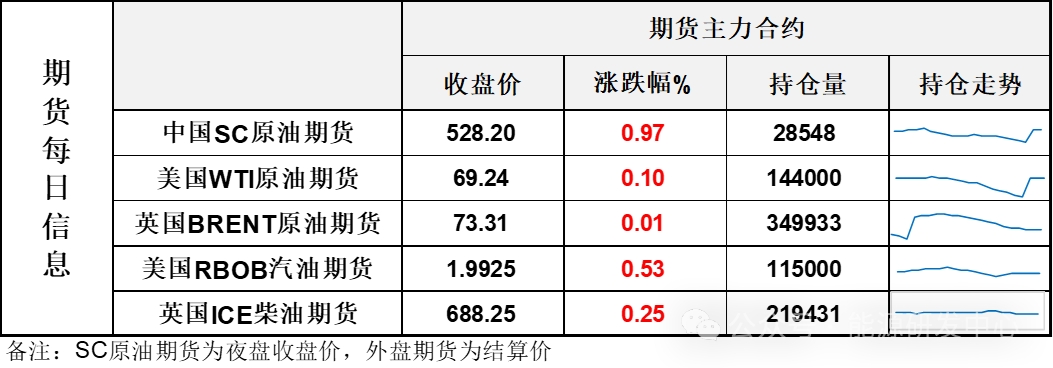【1】WTI主力原油期貨收漲0.07美元,漲幅0.1%,報(bào)69.24美元/桶;布倫特主力原油期貨收漲0.01美元,漲幅0.01%,報(bào)73.31美元/桶;INE原油期貨收漲0.97%,報(bào)528.2元。
