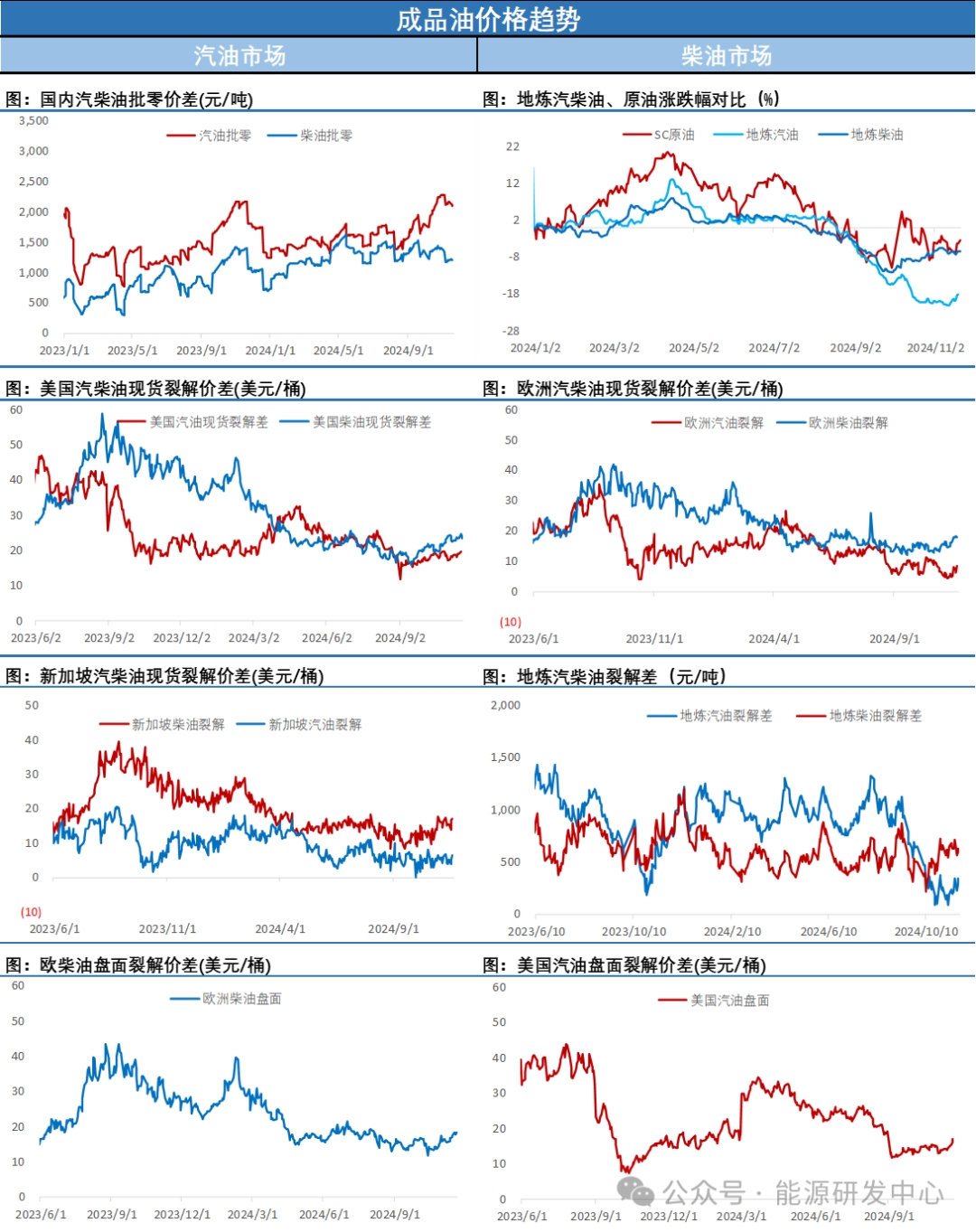 另外市場也開始關注歐佩克+是否會在12月會議上做出再次延長減產(chǎn)時間的決定,在低于預期的需求面前,做出繼續(xù)延長減產(chǎn)時間對歐佩克+來說是更加合理的決定,但2025年歐佩克+內(nèi)部面臨合作的挑戰(zhàn),阿聯(lián)酋提升產(chǎn)量基準后2025年有增產(chǎn)空間,沙特如何協(xié)調成員國的利益將是面臨的一大挑戰(zhàn)。高頻指標方面隨著地緣風險升溫推動油價反彈,月差結構在近期跟隨走強,成品油方面周四美國汽油裂解差回落明顯,但在過去一段時間歐美成品油裂解差也有回暖動作,整體對油價回穩(wěn)有支撐。連續(xù)反彈之后油價已經(jīng)完全收復上周失地,區(qū)間震蕩的局面進一步得到強化。注意節(jié)奏把握,謹慎參與。