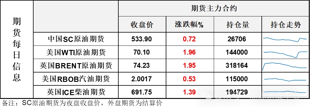 【1】WTI主力原油期貨收漲1.35美元,漲幅1.96%,報70.1美元/桶;布倫特主力原油期貨收漲1.42美元,漲幅1.95%,報74.23美元/桶;INE原油期貨收漲0.72%,報533.9元。