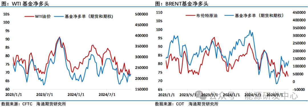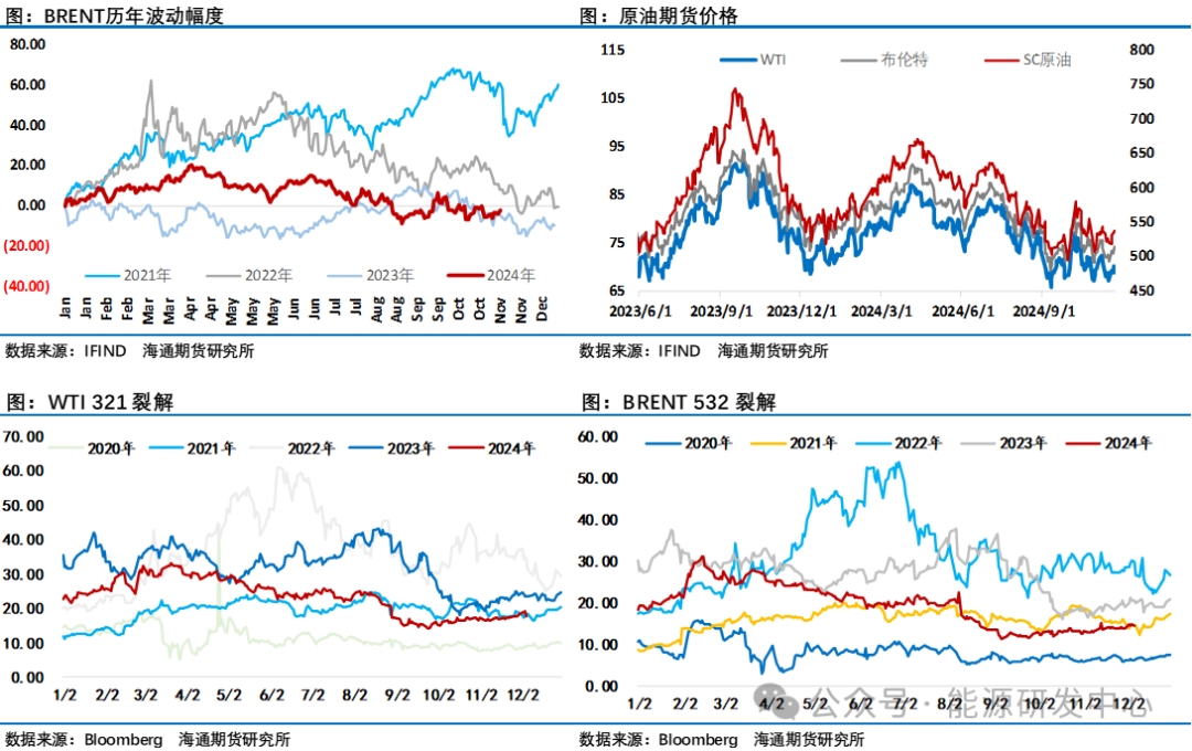 除了地緣因素吸引參與者眼球,供需層面接下來歐佩克+產(chǎn)量政策的變化也將成為關(guān)注點(diǎn),考慮到目前市場主流機(jī)構(gòu)認(rèn)定歐佩克+一旦退出自愿減產(chǎn),2025年將迎來非常明顯的供應(yīng)過剩局面。因此近期市場主流預(yù)測是歐佩克+將繼續(xù)延遲退出自愿減產(chǎn)時(shí)間,存在延遲一個(gè)月和一個(gè)季度的選項(xiàng),這意味著給了市場的預(yù)期是歐佩克+在12月月度會(huì)議上需要做出延遲減產(chǎn)的決定,而歐佩克+面臨的現(xiàn)實(shí)局面是在6月會(huì)議上阿聯(lián)酋日產(chǎn)量配額上調(diào)30萬桶,從2025年1月至9月逐漸完成,平均每月增產(chǎn)3.3萬桶,這樣的決定在半年前安撫了阿聯(lián)酋繼續(xù)配合歐佩克+減產(chǎn)來維持石油市場穩(wěn)定。這也意味著阿聯(lián)酋將可以在2025年提升產(chǎn)量,而阿聯(lián)酋增產(chǎn)對于減產(chǎn)合作來說是個(gè)挑戰(zhàn),在這之前部分國家就一直自愿減產(chǎn)不達(dá)標(biāo),阿聯(lián)酋產(chǎn)量的提升會(huì)進(jìn)一步給自愿減產(chǎn)執(zhí)行度帶來挑戰(zhàn)。屆時(shí)沙特、俄羅斯為核心的歐佩克+如何平衡內(nèi)部利益及說服相關(guān)成員國繼續(xù)團(tuán)結(jié)一致保持當(dāng)前產(chǎn)量是一個(gè)非常有考驗(yàn)的選項(xiàng)。