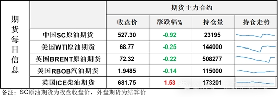 【1】WTI主力原油期貨收跌0.17美元,跌幅0.25%,報(bào)68.77美元/桶;布倫特主力原油期貨收跌0.16美元,跌幅0.22%,報(bào)72.32美元/桶;INE原油期貨收跌0.92%,報(bào)527.3元。
