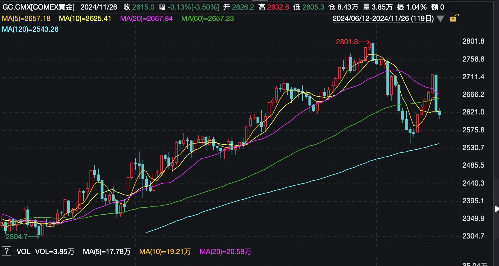 上周國(guó)際金價(jià)(2654.72, 8.42, 0.32%)呈現(xiàn)持續(xù)上漲態(tài)勢(shì),創(chuàng)出“五連陽(yáng)”,一度上破2700美元/盎司高位。但11月25日,紐約黃金期貨主力合約大幅下挫,收跌3.13%,報(bào)2627.40美元/盎司;倫敦金現(xiàn)大跌3.33%,報(bào)2625.82美元/盎司。
