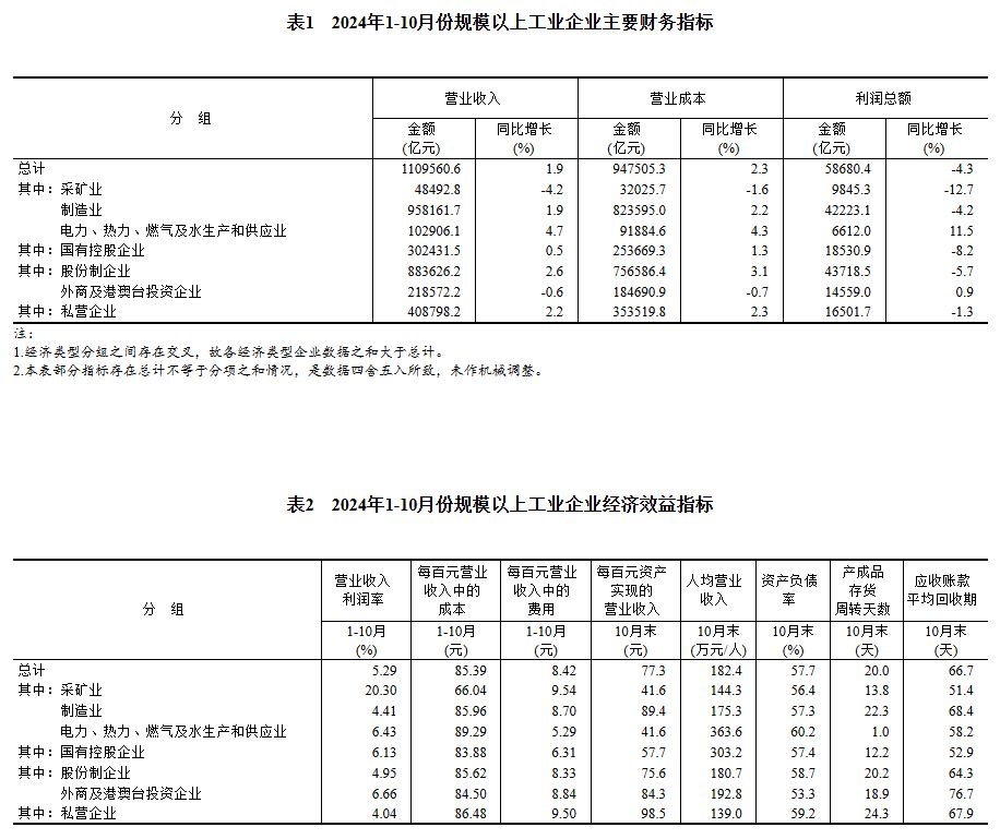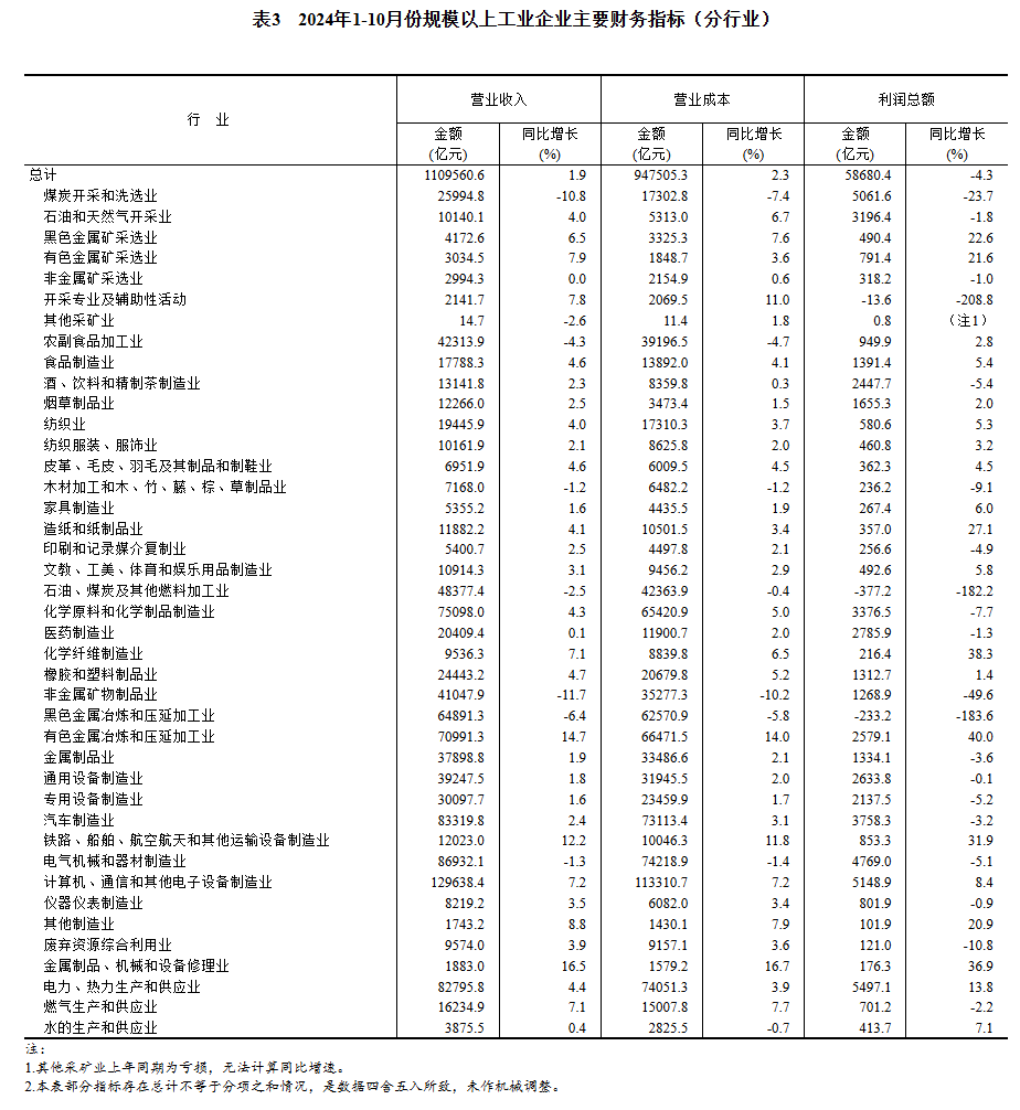 1—10月份,全國規(guī)模以上工業(yè)企業(yè)實現(xiàn)利潤總額58680.4億元,同比下降4.3%(按可比口徑計算,詳見附注二)。