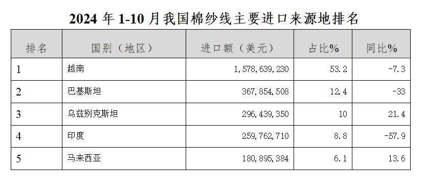 從大類產(chǎn)品看,2024年1-10月進(jìn)口棉紗線29.7億美元,同比下降17.7%,進(jìn)口數(shù)量124.4萬噸,同比下降9.8%;進(jìn)口化纖11.9億美元,同比上漲3.4%;進(jìn)口絲線和羊毛、動物紗線分別為292.9萬美元和1.1億美元,同比增長47%和14.4%。我國紗線進(jìn)口以棉紗線為主,占紗線進(jìn)口總額的70%。