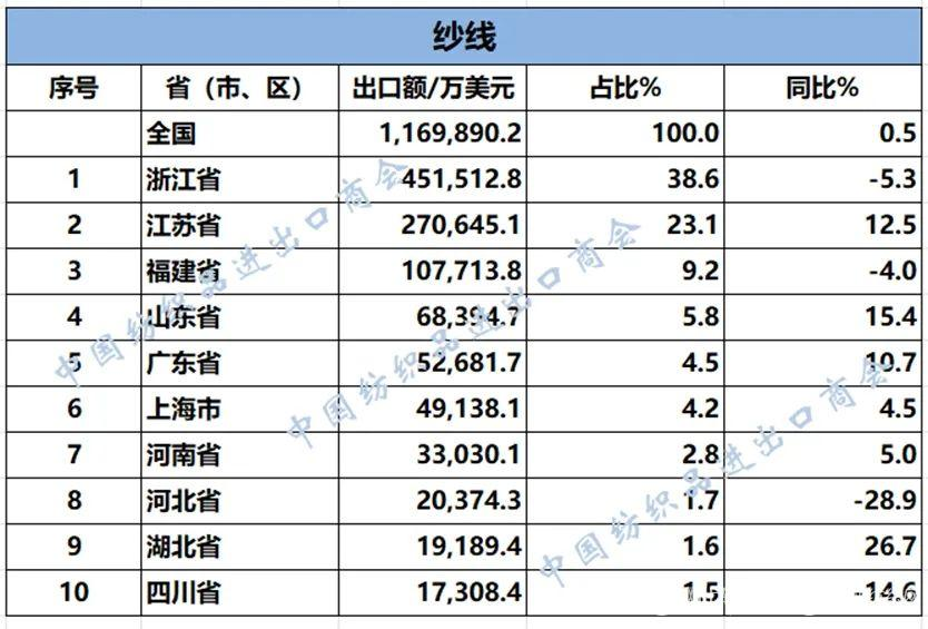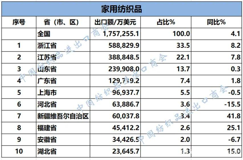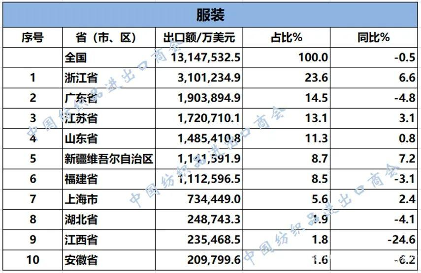2024年1-10月,我國紡織服裝累計出口2482.45億美元,同比增長1.7%。內(nèi)地31個省、自治區(qū)、直轄市紡織服裝統(tǒng)計數(shù)據(jù)已出爐,浙江省、江蘇省、廣東省、山東省、福建省分別列全國紡織服裝出口省市前五位,合計比重超七成。