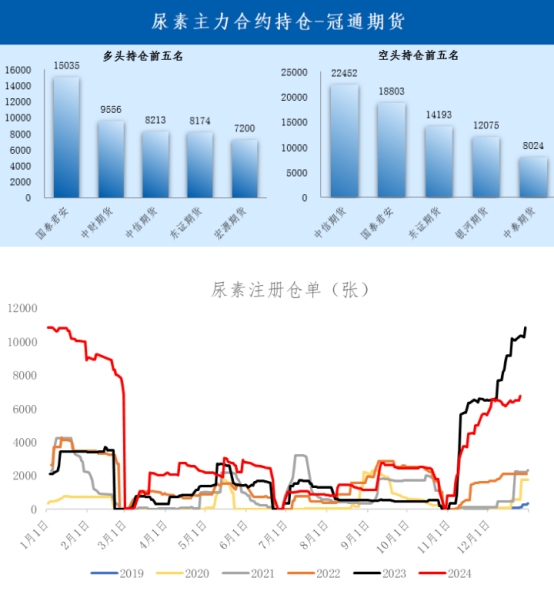 期貨方面:尿素主力2505合約1779元/噸跳空高開后偏弱震蕩,最終收于1771元/噸,收成一根下影線較長的小陰線,漲幅1.55%,日成交量明顯增加,持倉量200211手(+3791手)。前二十名主力持倉席位來看,多頭+5548手,空頭+1369手。其中,華融期貨凈多單增加2500手、中天期貨凈多單增加1534手、招商期貨凈多單減少1016手、一德期貨凈多單減少1405手;渤海期貨凈空單增加2227手、中泰期貨凈空單增加1165手、中信期貨凈空單增加1052手、方正中期凈空單減少2558手。