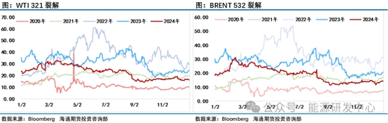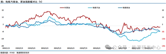 中國汽柴油年內(nèi)年內(nèi)分道揚(yáng)鑣各奔前程,卻又在年末再聚首,跌幅接近一致約7.5%。但整體表現(xiàn)明顯弱于原油,在中國能源轉(zhuǎn)型大背景下,成品油消費(fèi)提速達(dá)峰,根據(jù)三方機(jī)構(gòu)跟蹤分析2024年中國汽柴油被新能源等新增替代消費(fèi)量2000萬噸左右,累計(jì)替代消費(fèi)量超5000萬噸。從相關(guān)預(yù)測來看2025年仍會(huì)有1500萬噸的汽柴油消費(fèi)進(jìn)一步被替代,全球最大的原油進(jìn)口國正在引領(lǐng)原油消費(fèi)端的變化,這是一個(gè)原油市場的全新局面。