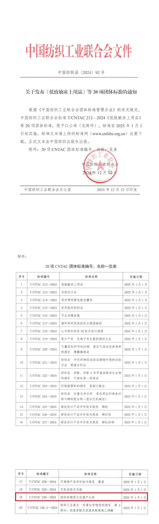 根據(jù)《中國紡織?業(yè)聯(lián)合會團體標(biāo)準(zhǔn)管理辦法》的有關(guān)規(guī)定,中國紡織?業(yè)聯(lián)合會于2024年12月31日批準(zhǔn)發(fā)布T/CNTAC230-2024《紡織?物質(zhì)?化遺產(chǎn)分類》團體標(biāo)準(zhǔn),該標(biāo)準(zhǔn)?2025年1?1?起實施。