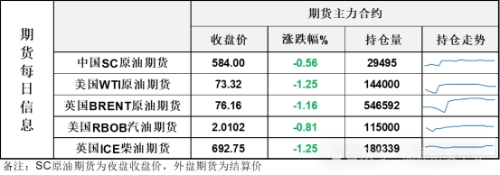 【1】WTI主力原油期貨收跌0.93美元,跌幅1.25%,報(bào)73.32美元/桶;布倫特主力原油期貨收跌0.89美元,跌幅1.16%,報(bào)76.16美元/桶;INE原油期貨收跌0.56%,報(bào)584元。