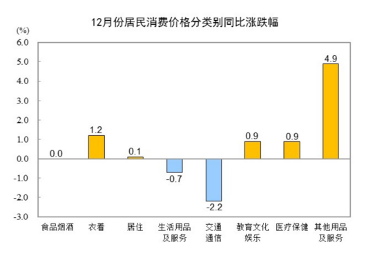 12月份,全國居民消費價格環(huán)比持平。其中,城市持平,農村下降0.1%;食品價格下降0.6%,非食品價格上漲0.1%;消費品價格下降0.1%,服務價格上漲0.1%。