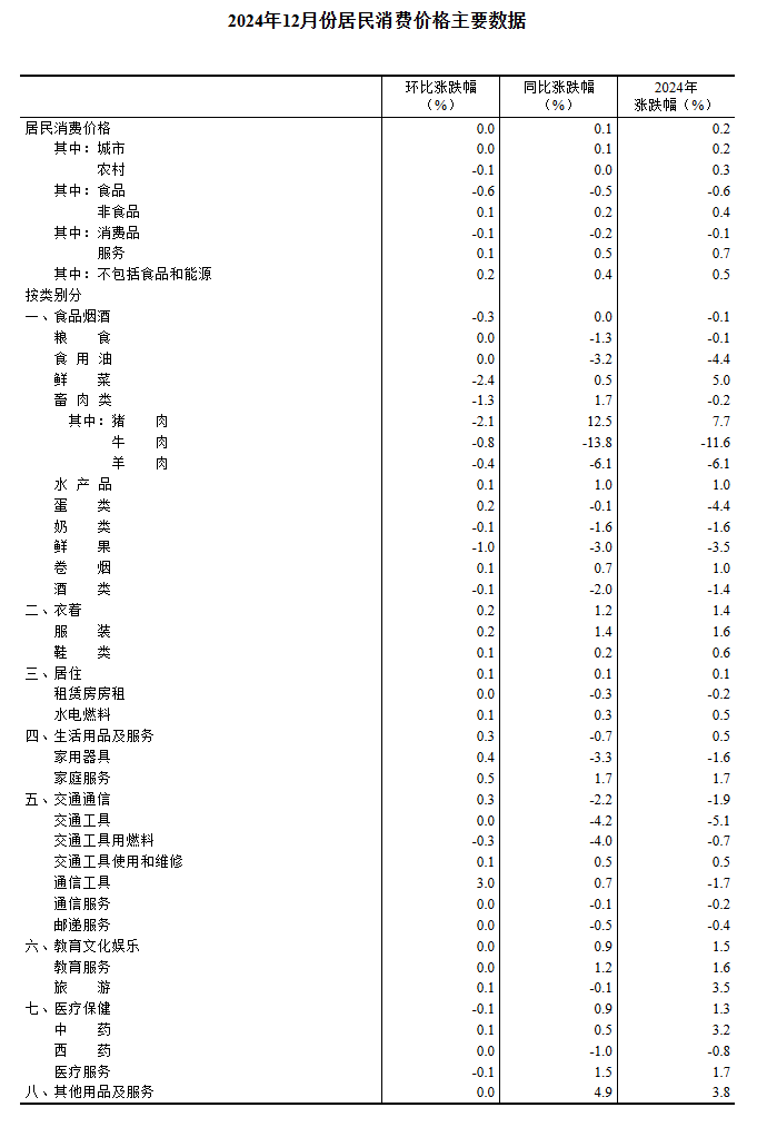 2024年12月份,全國居民消費價格同比上漲0.1%。其中,城市上漲0.1%,農村持平;食品價格下降0.5%,非食品價格上漲0.2%;消費品價格下降0.2%,服務價格上漲0.5%。