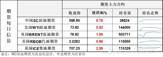 【1】WTI主力原油期貨收漲0.6美元,漲幅0.82%,報(bào)73.92美元/桶;布倫特主力原油期貨收漲0.76美元,漲幅1%,報(bào)76.92美元/桶;INE原油期貨收漲0.79%,報(bào)588.9元。