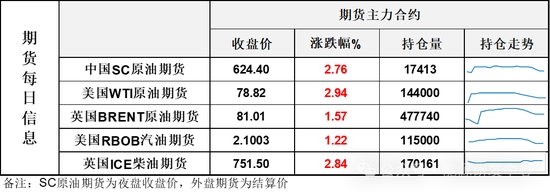 【1】WTI主力原油期貨收漲2.25美元,漲幅2.94%,報(bào)78.82美元/桶;布倫特主力原油期貨收漲1.25美元,漲幅1.57%,報(bào)81.01美元/桶;INE原油期貨收漲2.76%,報(bào)624.4元。