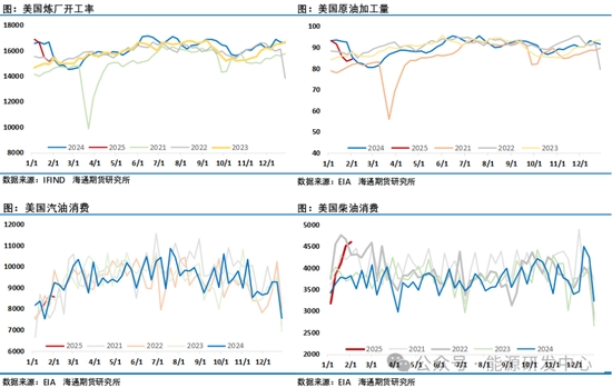 從原油市場供需層面來看,最新一期美國EIA原油庫存大幅累庫,后續(xù)原油進入季節(jié)性累庫階段,但全口徑庫存整體低于去年同期,庫存壓力不大。需求層面美國柴油消費數(shù)據(jù)受前期寒潮提振明顯高于去年同期,汽油消費一般但接下來將進入季節(jié)性回升階段。中國市場則在春節(jié)過后汽油消費回落,柴油后續(xù)將有所提升,但從原油加工量來看,中國原油加工量明顯低于去年同期,尤其是受原料供應影響的地方煉廠加工量下降明顯。