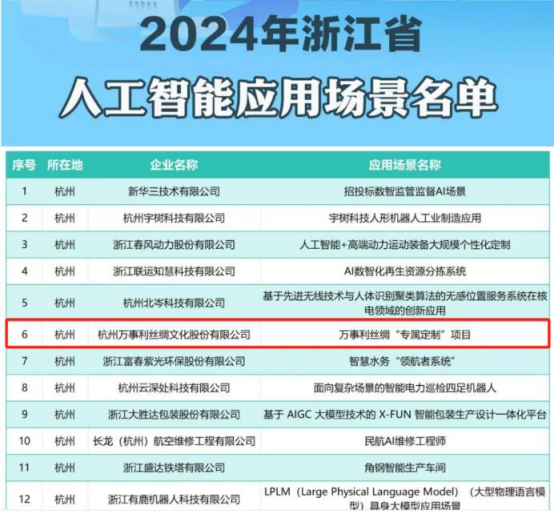 萬(wàn)事利絲綢主導(dǎo)的“人工智能專屬定制”項(xiàng)目入選《2024年浙江省人工智能應(yīng)用場(chǎng)景名單》