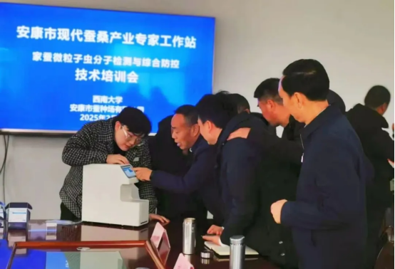 家蠶微粒子病是嚴(yán)重危害蠶種生產(chǎn)的傳染性疫病,可導(dǎo)致蠶桑生產(chǎn)減產(chǎn)甚至絕收,給蠶農(nóng)造成巨大的經(jīng)濟(jì)損失。潘國慶團(tuán)隊(duì)長期致力于家蠶微粒子病防控技術(shù)研究,在病源生物學(xué)、檢測技術(shù)、綜合防治等方面取得了一系列重要成果。此次考察期間,專家團(tuán)隊(duì)深入蠶種生產(chǎn)車間、質(zhì)量檢驗(yàn)室,詳細(xì)了解安康市蠶種場有限公司家蠶微粒子病發(fā)生現(xiàn)狀和防控措施;雙方就家蠶微粒子孢子形態(tài)變化、致病機(jī)理、檢測技術(shù)進(jìn)化、防控技術(shù)演進(jìn)、質(zhì)量標(biāo)準(zhǔn)驗(yàn)證等進(jìn)行了座談交流。潘國慶研究員一行還應(yīng)邀給公司的專業(yè)技術(shù)人員做了學(xué)術(shù)報(bào)告,生動(dòng)的講解微孢子蟲分類、感染機(jī)制,核酸檢測方法等知識(shí),現(xiàn)場演示了分子檢測設(shè)備使用方法。