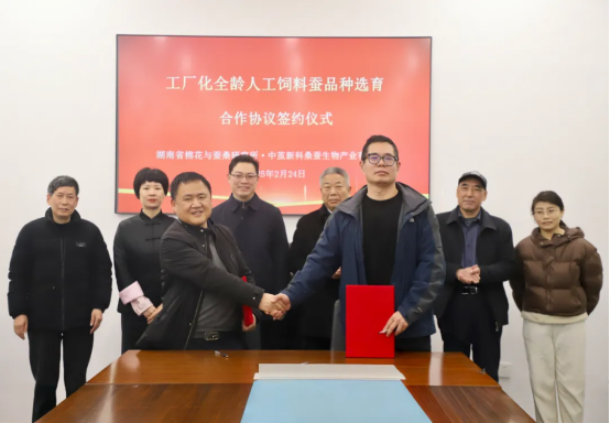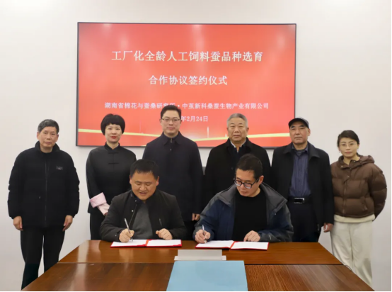2月24日,湖南省棉花與蠶桑研究所和中繭新科桑蠶生物產(chǎn)業(yè)有限公司隆重舉行了工廠化全齡人工飼料蠶品種選育合作協(xié)議簽約儀式。國家蠶桑產(chǎn)業(yè)技術(shù)體系長沙綜合實(shí)驗(yàn)站站長、湖南省棉花與蠶桑研究所二級(jí)研究員艾均文博士與中繭新科副總經(jīng)理于新杰簽署了合作協(xié)議,湖南省棉花與蠶桑研究所所長劉飛馳、中繭新科董事長范茂林、中繭新科首席科學(xué)家崔為正見證了這一重要時(shí)刻。