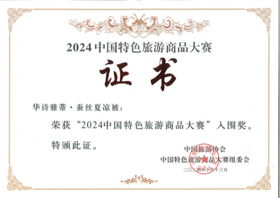在2024年中國特色旅游商品大賽暨中國旅游商品大賽上,華詩雅蒂創(chuàng)新研發(fā)的蠶絲夏涼被,憑借卓越品質(zhì)與獨(dú)特設(shè)計(jì),在眾多參賽商品中嶄露頭角,最終榮獲“2024年中國特色旅游商品大賽”入圍獎(jiǎng)。