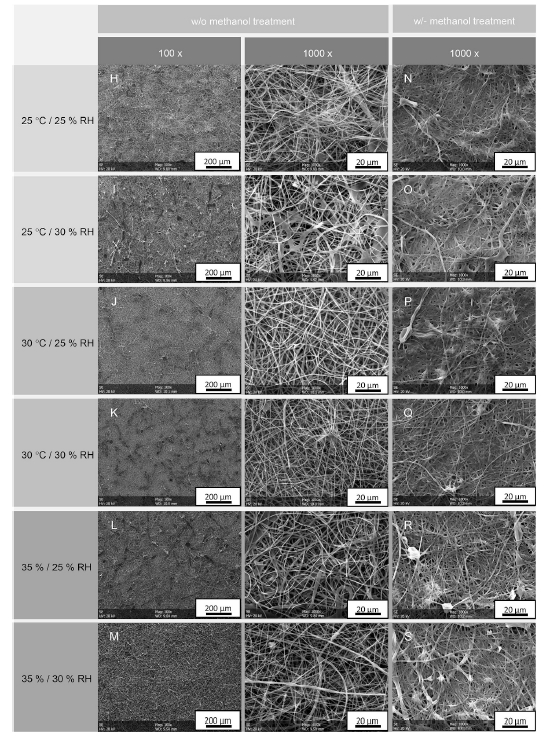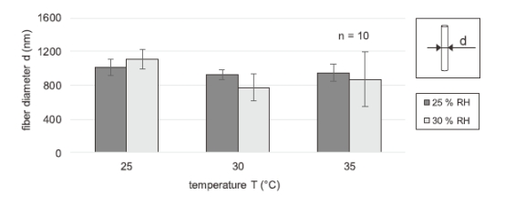 纖維形貌:25°C、30% RH:纖維表面液滴增多,直徑標(biāo)準差大。35°C、30% RH:纖維直徑差異最大(418 nm),結(jié)構(gòu)松散。30°C、25% RH:纖維最均勻(998±63 nm),無缺陷(圖2)。