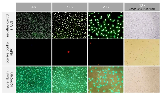 細胞毒性實驗表明:純絲素蛋白非織造布的細胞代謝活性與陰性對照組(TCC)無顯著差異(p>0.05),遠高于陽性對照組(含ZDEC的聚氨酯膜)。染色顯示,纖維表面細胞存活率>95%,形態(tài)舒展,無毒性跡象(圖4)。