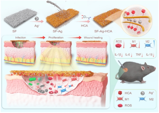 示意圖1:SF-Ag-HCA制備流程及作用機(jī)制(抗菌+抗氧化雙功能協(xié)同)