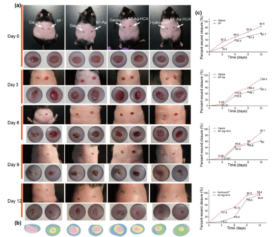 圖5a-b的H&E和Masson染色顯示,SF-Ag-HCA組表皮層完整,膠原排列致密有序,沉積量比對照組高2倍!圖6a-c的愈合曲線更直觀:SF-Ag-HCA組傷口面積縮小速度是市售敷料的1.5倍。