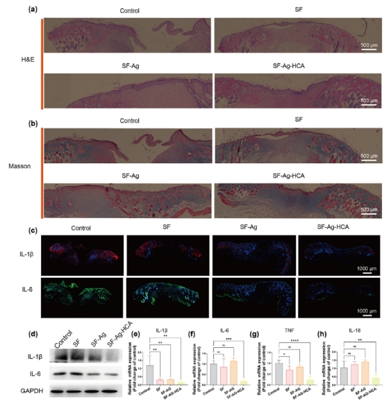 圖3d-g顯示,SF-Ag-HCA促進(jìn)促炎M1型巨噬細(xì)胞向修復(fù)型M2轉(zhuǎn)化,炎癥因子IL-1β、IL-6表達(dá)顯著降低(圖5c-h)。Westernblot(圖5d)證實(shí)其抑制炎癥信號通路,為傷口愈合按下“加速鍵”。