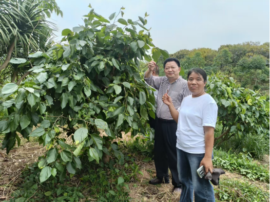 劉吉平教授(左一)在廣西桂牛水牛乳業(yè)股份有限公司的水牛小鎮(zhèn)生態(tài)桑蠶養(yǎng)殖基地果桑園調(diào)研